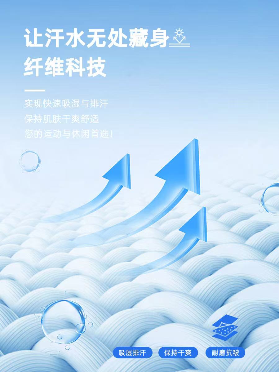 聚酯纖維有著出色的速干性能,能快速吸收并蒸發汗液,保持身體干爽。同時,它具備良好的耐磨性和抗皺性,經久耐穿,日常穿著和洗滌也不易變形起皺,打理起來更方便。