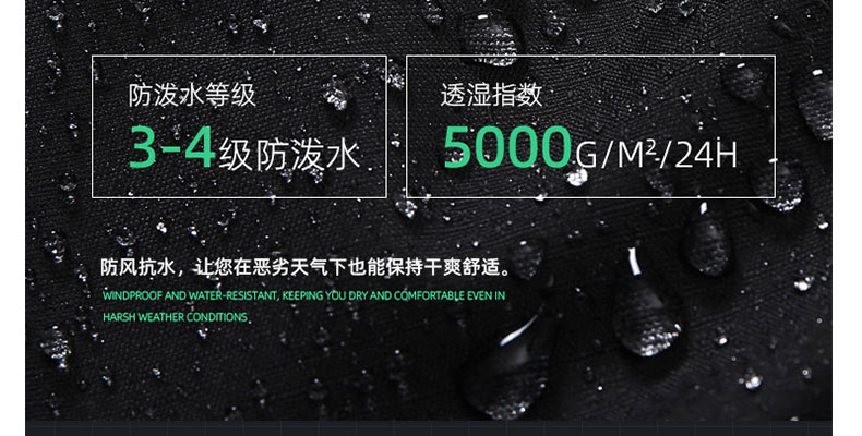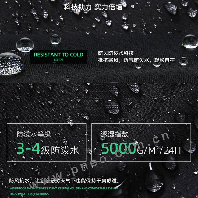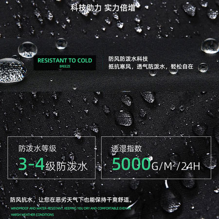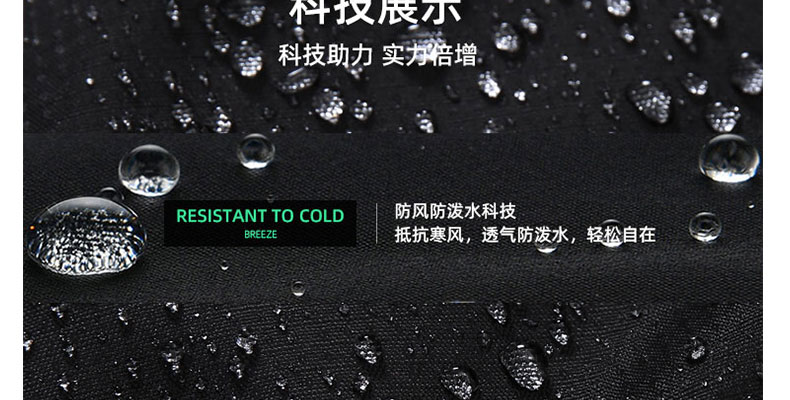 防潑水科技面料,類似荷葉效果,有效的阻擋小雨對人體運動的干擾,保持干爽舒適