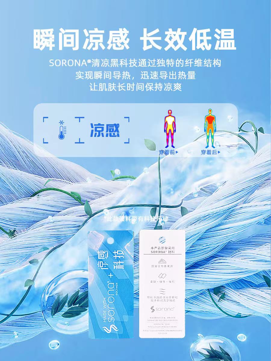 涼感原理是什么:涼感索羅娜圓領T恤的涼感主要源于面料中添加的特殊成分,如優可絲等。這些成分能讓面料具有良好的熱傳導性能,接觸皮膚時可快速吸收并散發人體熱量,使肌膚產生涼爽感。同時,索羅娜纖維本身也有一定的散熱作用,幫助保持身體涼爽。